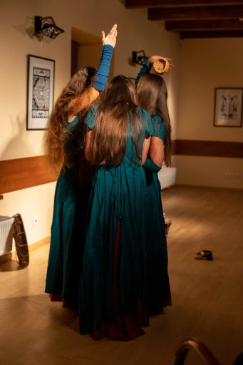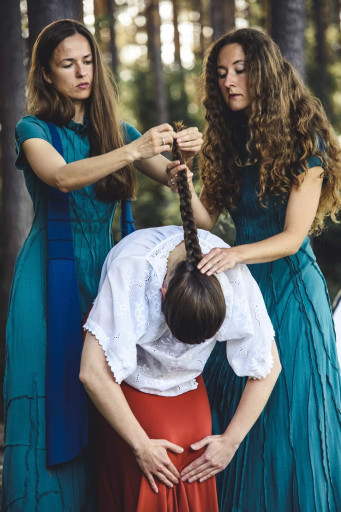 Three wichy vocals combined with tribal drums and wild rythms. While experimenting with their voices, sharing Lithuanian old songs and sutartinės together with gipsy energy and shamanic rythms.