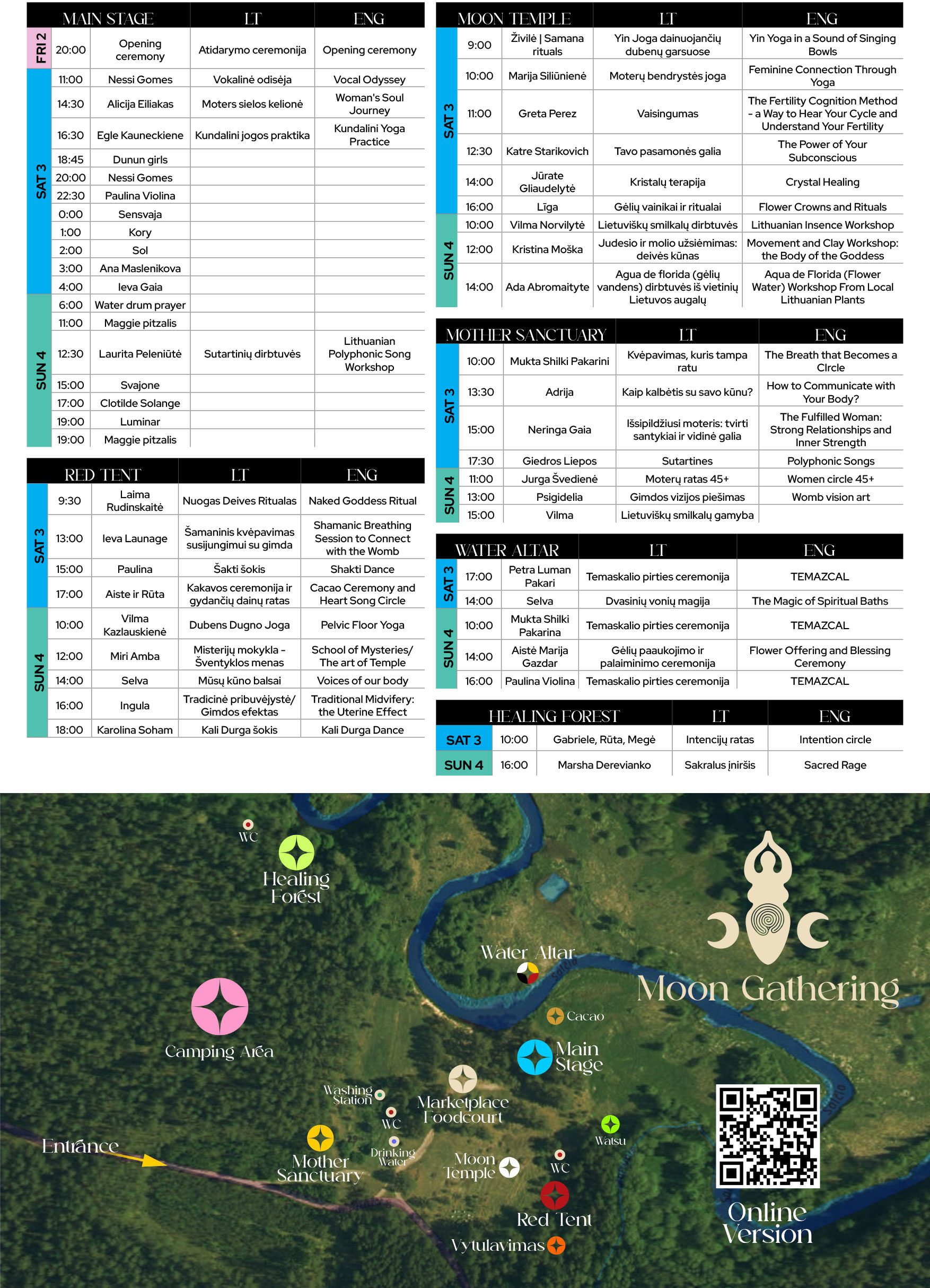 Moon Temple The Breath that becomes a Circle Praktika Mukta Shilki Pakarina IT Crystal Healing Dirbtuvės Jūratė Gliaudelytė LT Giedros Liepos “Sutartinės” Dirbtuvės Vilma Norvilytė, Raminta Ka, Indrė Dobrovolskė LT How to communicate with your body? Praktika Adrija Čepaitė LT Lithuanian Insence Workshop Dirbtuvės Vilma Norvilytė/Tarp Samanų LT Movement and Clay workshop: The body of the Goddess Dirbtuvės Kristina Skaldina-Moška LT Naked Goddess Ritual Praktika Laima Rudinskaitė LT The fulfilled woman: strong relationships and inner strength Lecture Neringa Gaja Namai LT Yin Yoga in a sound of singing bowls Praktika Živile Samana Rituals LT